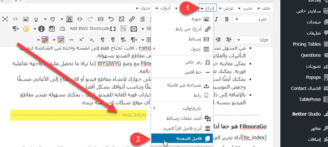 أما في ثيمات ووردبريس التي أصبحت تباع أخيراََ و بعد إنتشار فكرة تحكيم أدسنس و غيرها من المجالات ، أصبح معظم المدونين يطلبون إضافة تقسيم المقالات على قوالب الووردبريس ، لذا المطوورين قاموا بإضافتها تلقائيا في أغلب القوالب و هي تشتغل بطريقة تلقائية ، و كل ما عليك فعله يقتصر على الصورة التالية ، حيث انو بعد تحديد مكان التقسيم تقوم بالذهاب إلى إدراج ، ثم تختار فاصل الصفحة و بهذا تكون قسمتها و تضعها في اي مكان تريد التقسيم فيه .